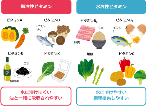 ほかの脂溶性ビタミンは体脂肪に蓄えることができるけど、B群やCの場合は、一生懸命とっても、使えない分はそのまま尿になって出ていっちゃいます。