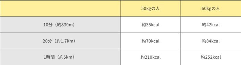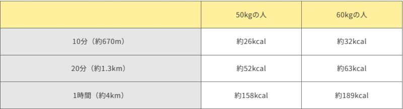 一般的な体重(50kgと60kg)、時間(10分・20分・1時間)、速度(普通・早歩き)ごとの消費カロリーがどのくらい違うのか比較してみました。