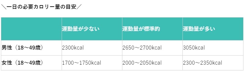 一般的に30~40代女性の摂取エネルギー量(運動量:ふつう)は、個人差はあるけど「2050kcal/日」くらいです。