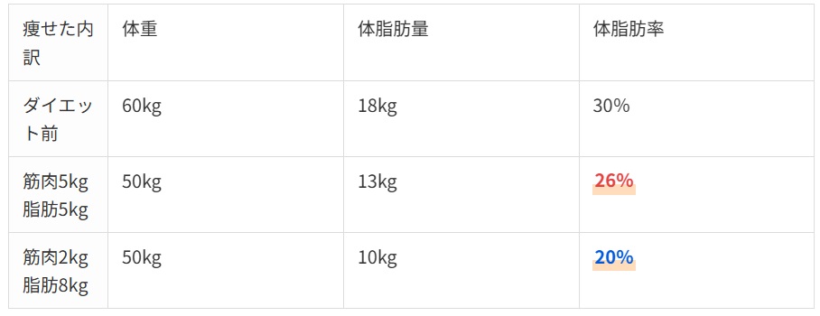 体重60kg体脂肪率30%の人が10kg痩せた場合に、脂肪と筋肉が5kgずつ落ちたとしたら、ダイエット後の体脂肪率は26%です。