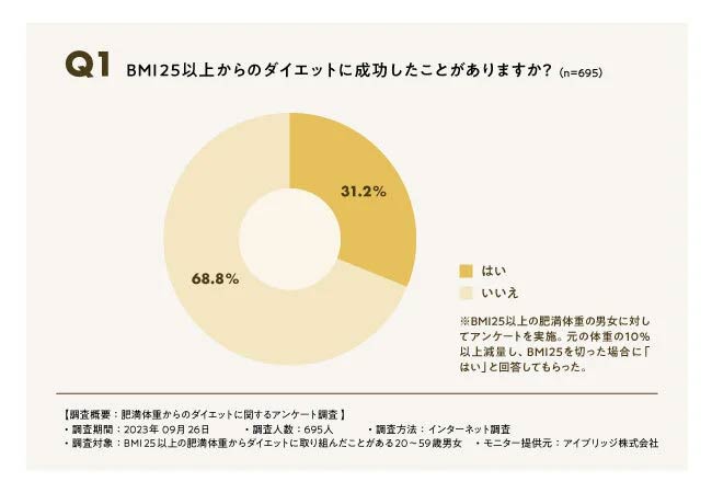 実際に肥満体重からダイエットに挑戦した人を対象に行ったアンケートでは、ダイエットに成功したのは全体の31.2%と1/3以下でした。