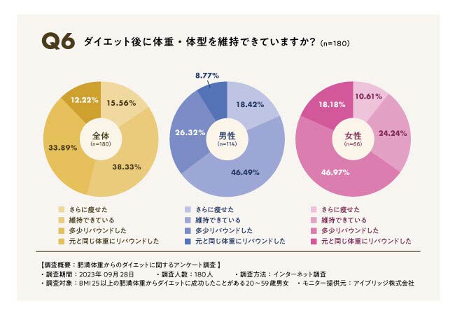 ダイエット後のリバウンド状況を見ても、全体では46.09%と半数近くがリバウンドしていて、女性に絞って見ると65.15%と約2/3がリバウンドしてしまっています。