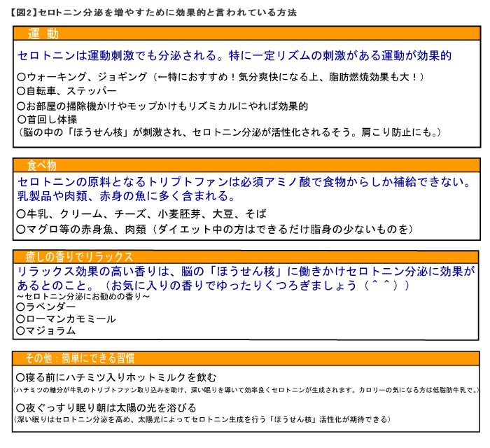 そういう物を食べることじゃなくて、日常的な行動でセロトニン分泌増加に効果的、と言われていることを図2にまとめてみました。