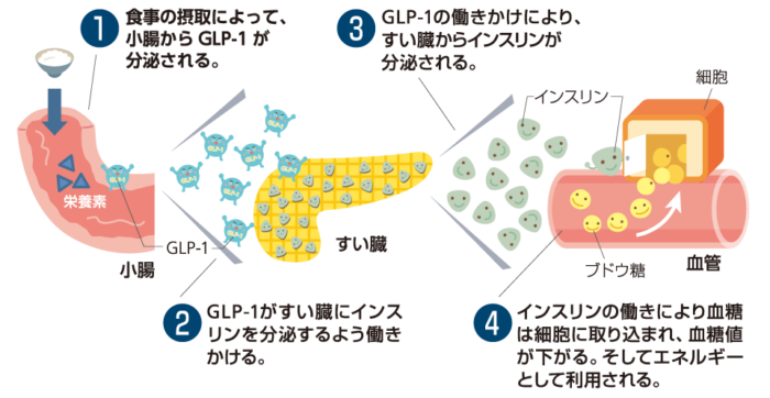 GLP-1(グルカゴン様ペプチド-1)は、腸から分泌されるホルモンの一種で、血糖値の上昇を抑えたり、食欲を抑制する働きがあります。