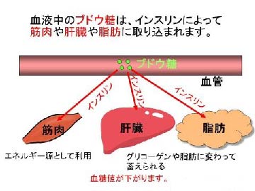 インスリンは、血液中の糖を肝臓⇒筋肉⇒脂肪細胞の順に送り込んで、血中の糖濃度を一定に保つ役割をしています。
