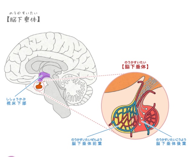 脳下垂体は、頭蓋(ずがい)骨のほぼ中心にあって、額の奥(おく)約7cmのところにある小指の先ほどの小さな器官で、下垂体ともいいます。